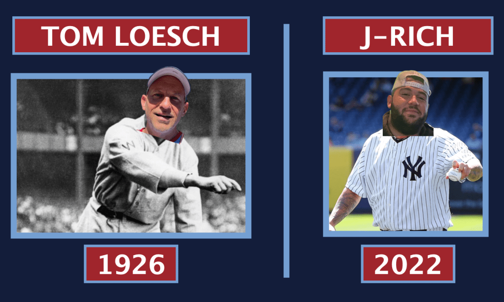 While Nick Rizzi was looking for Tom Loesch hitting tutorials in the North Shore Public Library Archives, he was able to find an image from Tom Loesch’s pitching debut all the way back in 1926. Tom recorded the win in a 4-2 victory against the Rutabagas as they did not change their name to ‘Bagas’ until the 80’s and this was considered the ‘Dead Ball Era.’ Here’s a side by side of he and Rich from their first pitching appearances with MVP.