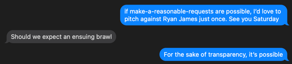 The GM, Alex Bettenhauser, texted SWR Varsity Baseball Coach and Baga fill-in, Kevin Willi, regarding a potential match-up during the SWR alumni game on Saturday.