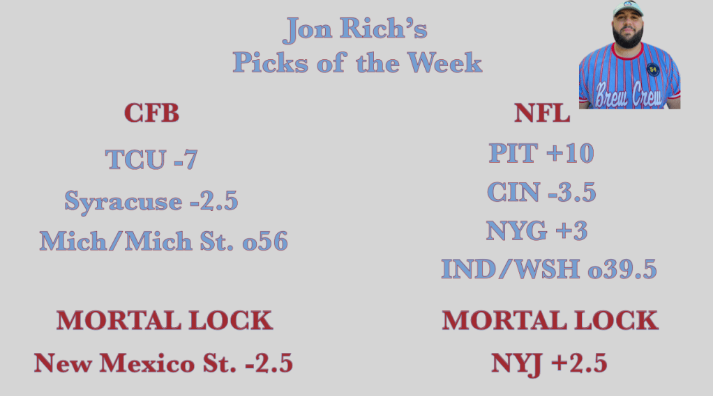 Rich went 2-3 in both CFB and NFL bets last week which has dipped to 46.67% win rate and 50% on mortal locks. Last week, however, Bubba’s most important bet, his Giants mortal lock, hit.