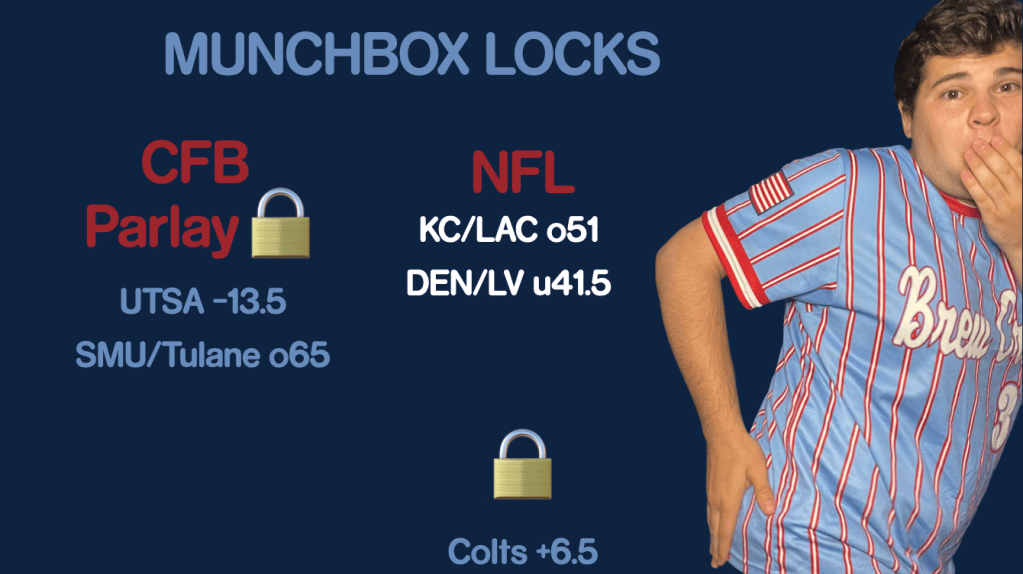 A tale of two days for young Munchie. He went a cool 1-3 in CFB, only hitting his moral lock bet and 2-1 in the NFL, only missing his mortal lock.