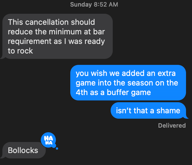 In an effort to be proactive, the GM scheduled a cupcake game against the last place Stoners during the weekend of the 4th, which is typically a bye week. This game was designed to give players more ABs, let Loesch play shortstop, and have an extra game in case of a rainout. Which we had last week. So what happened early Sunday morning? See below: